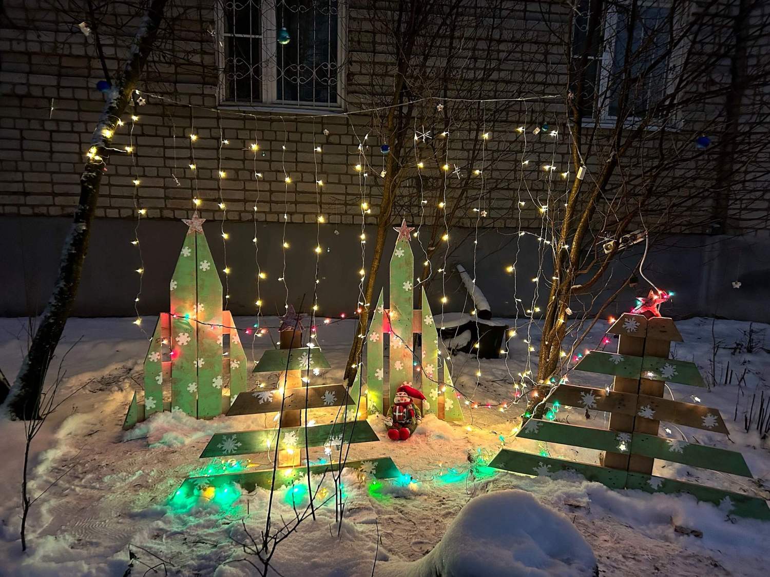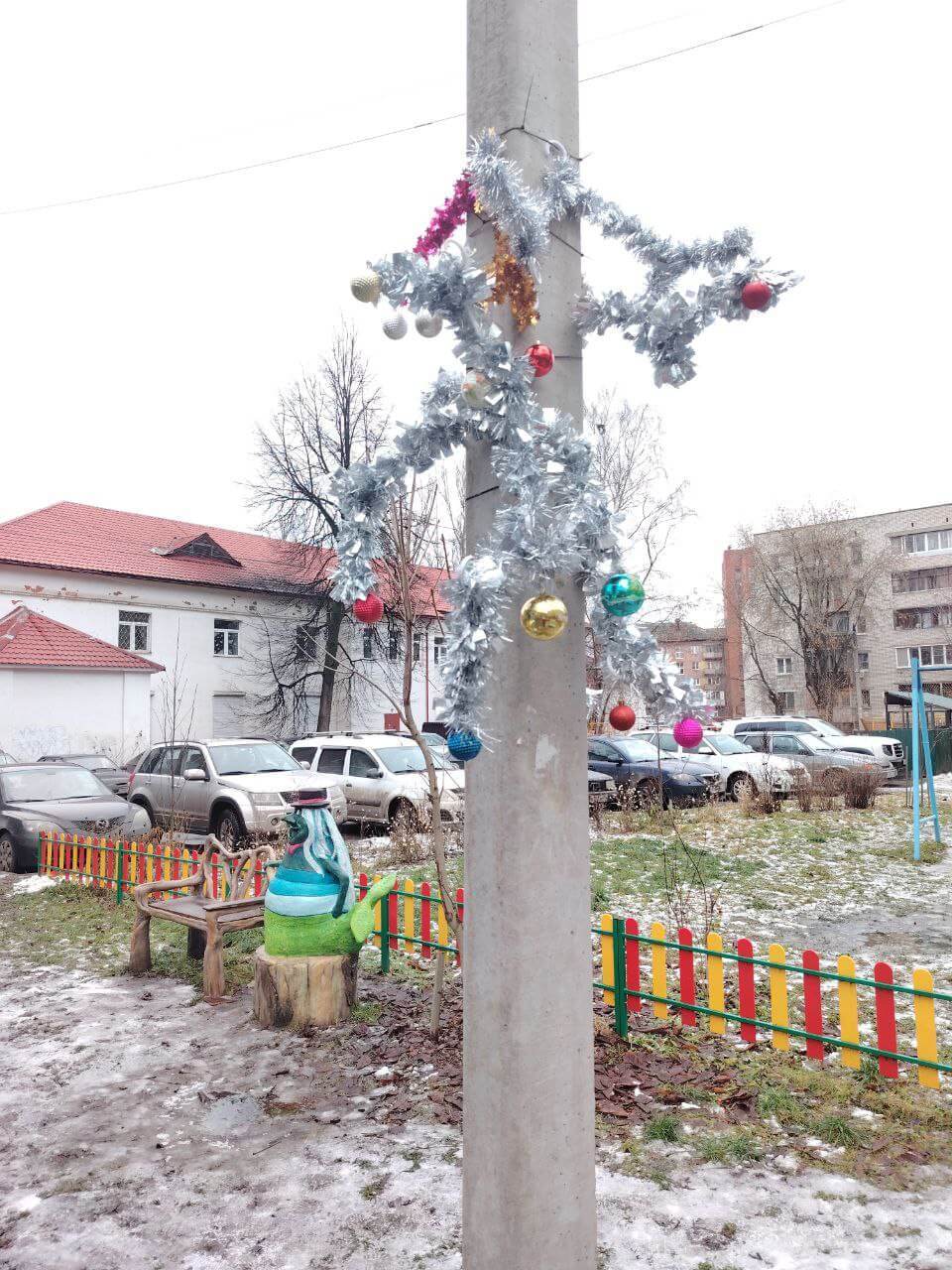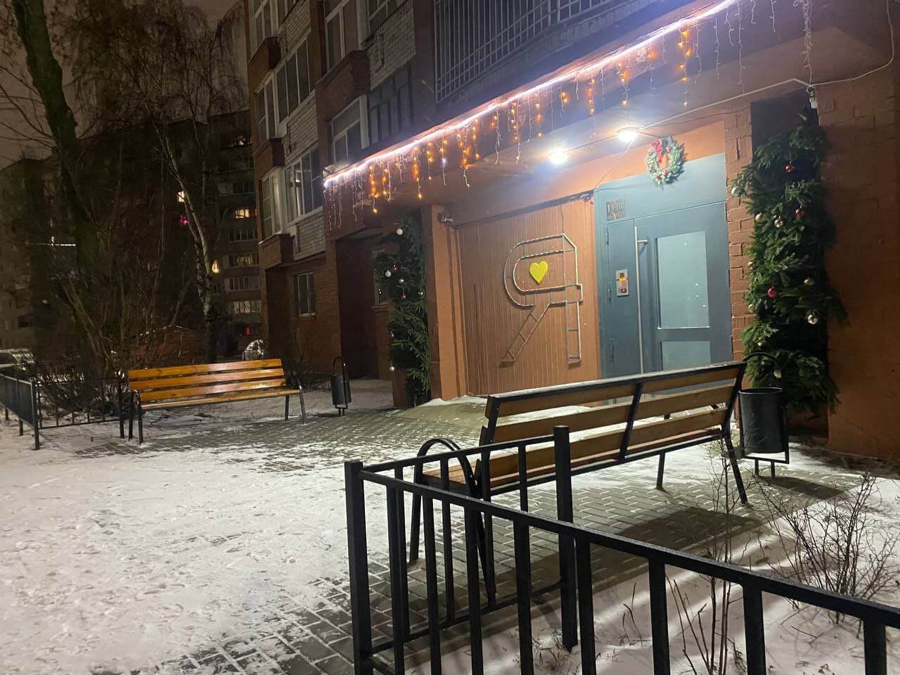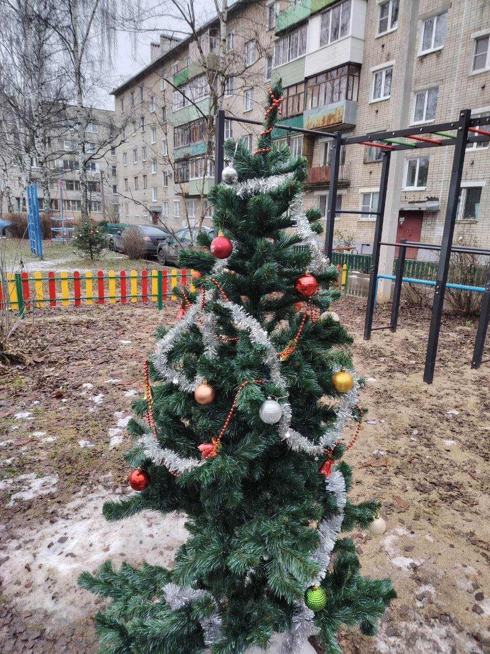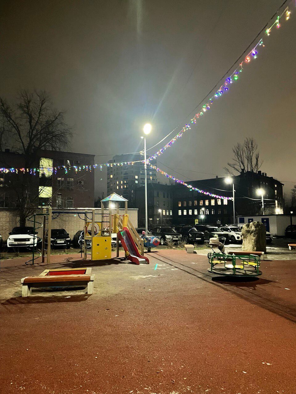 Для создания праздничного настроения во дворе установлена гирлянда над детской площадкой, световыми гирляндами оформлены хвойные насаждения у подъездов.