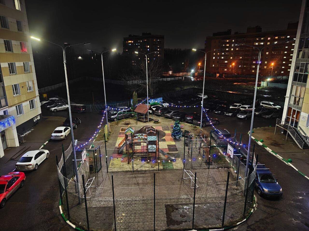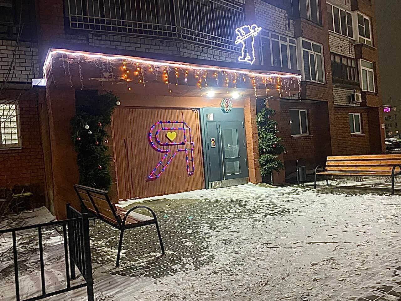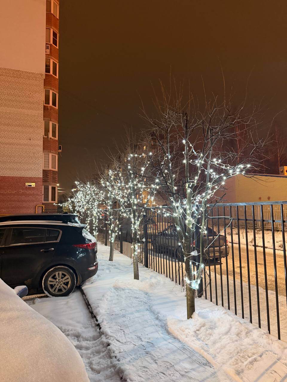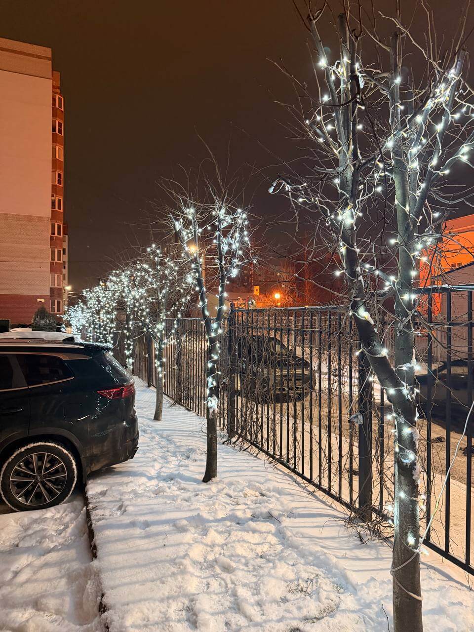 Для создания праздничного настроения во дворе установлена гирлянда над детской площадкой, световыми гирляндами оформлены хвойные насаждения у подъездов.