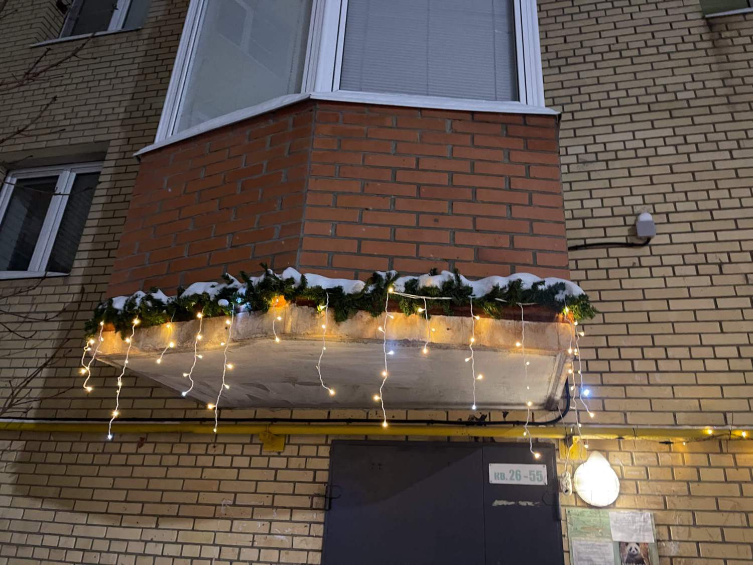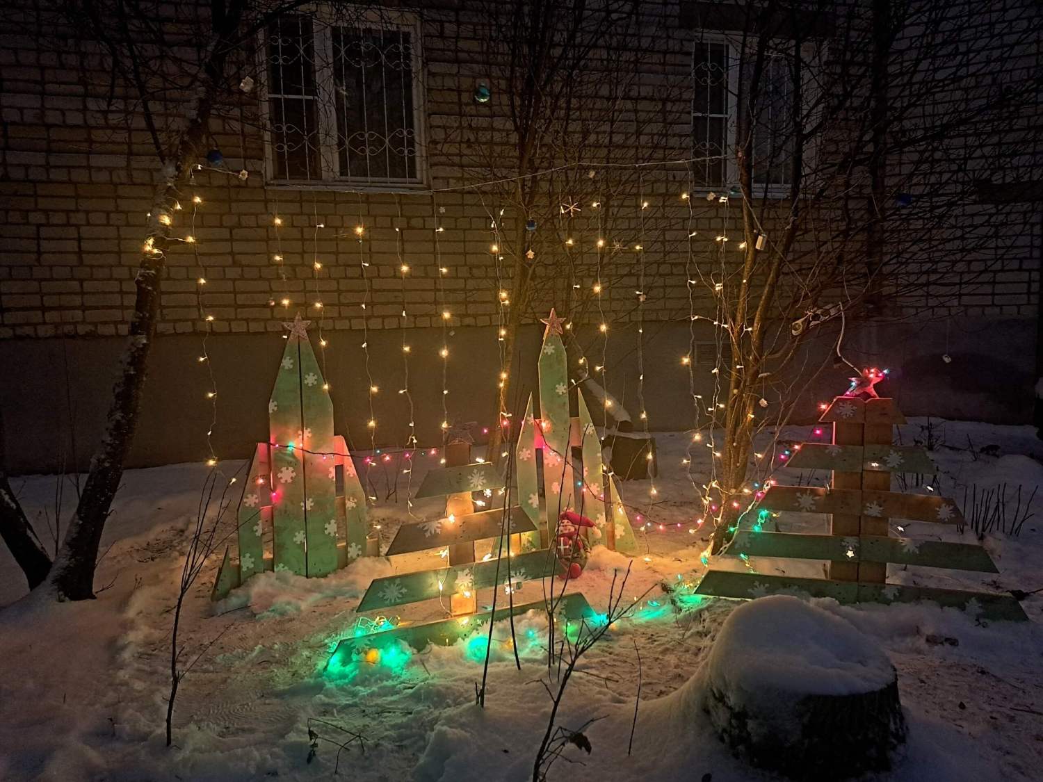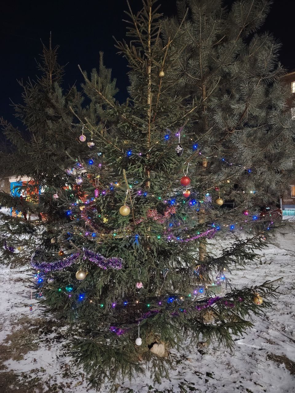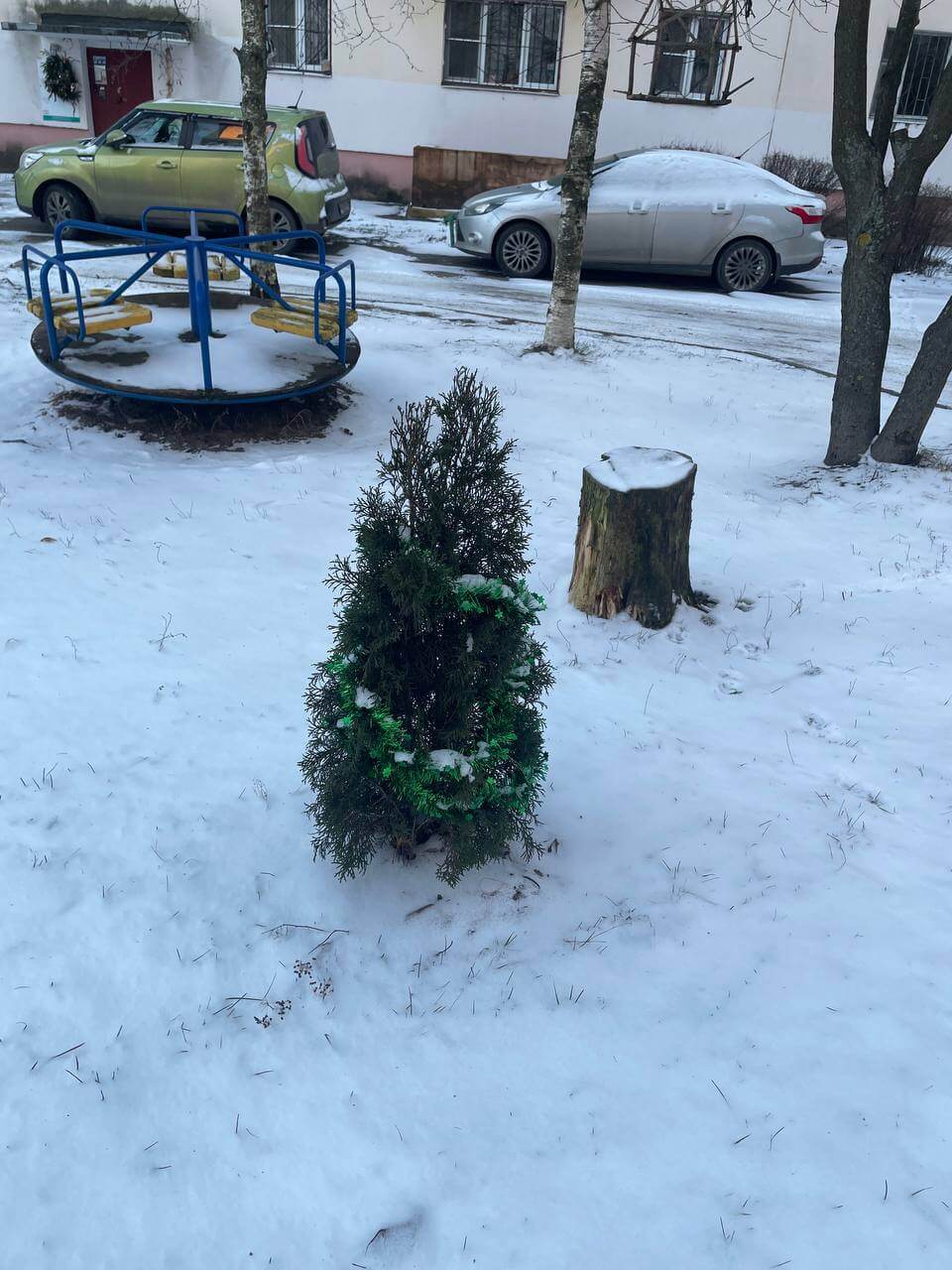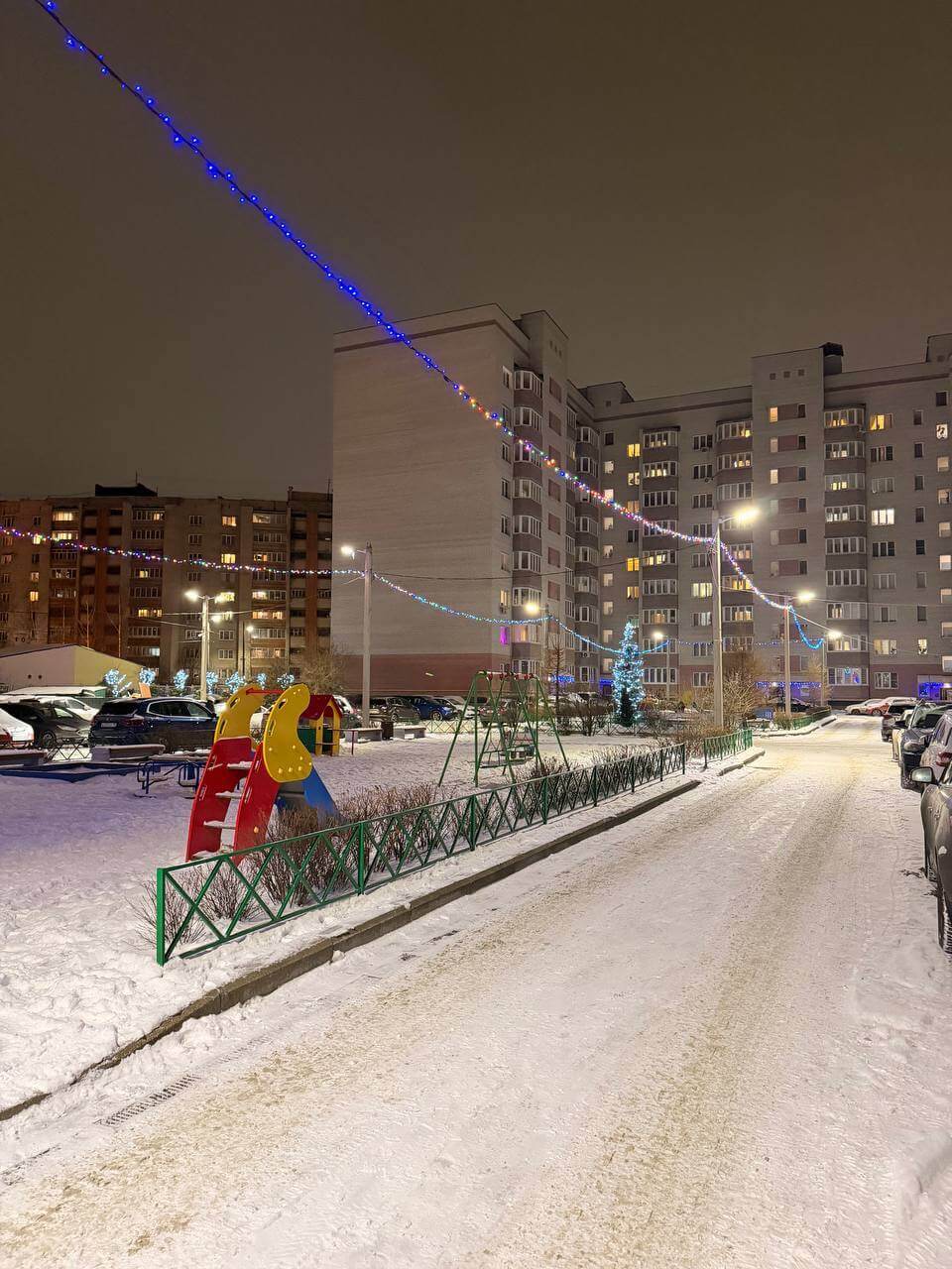 Для создания праздничного настроения во дворе установлена гирлянда над детской площадкой, световыми гирляндами оформлены хвойные насаждения у подъездов.