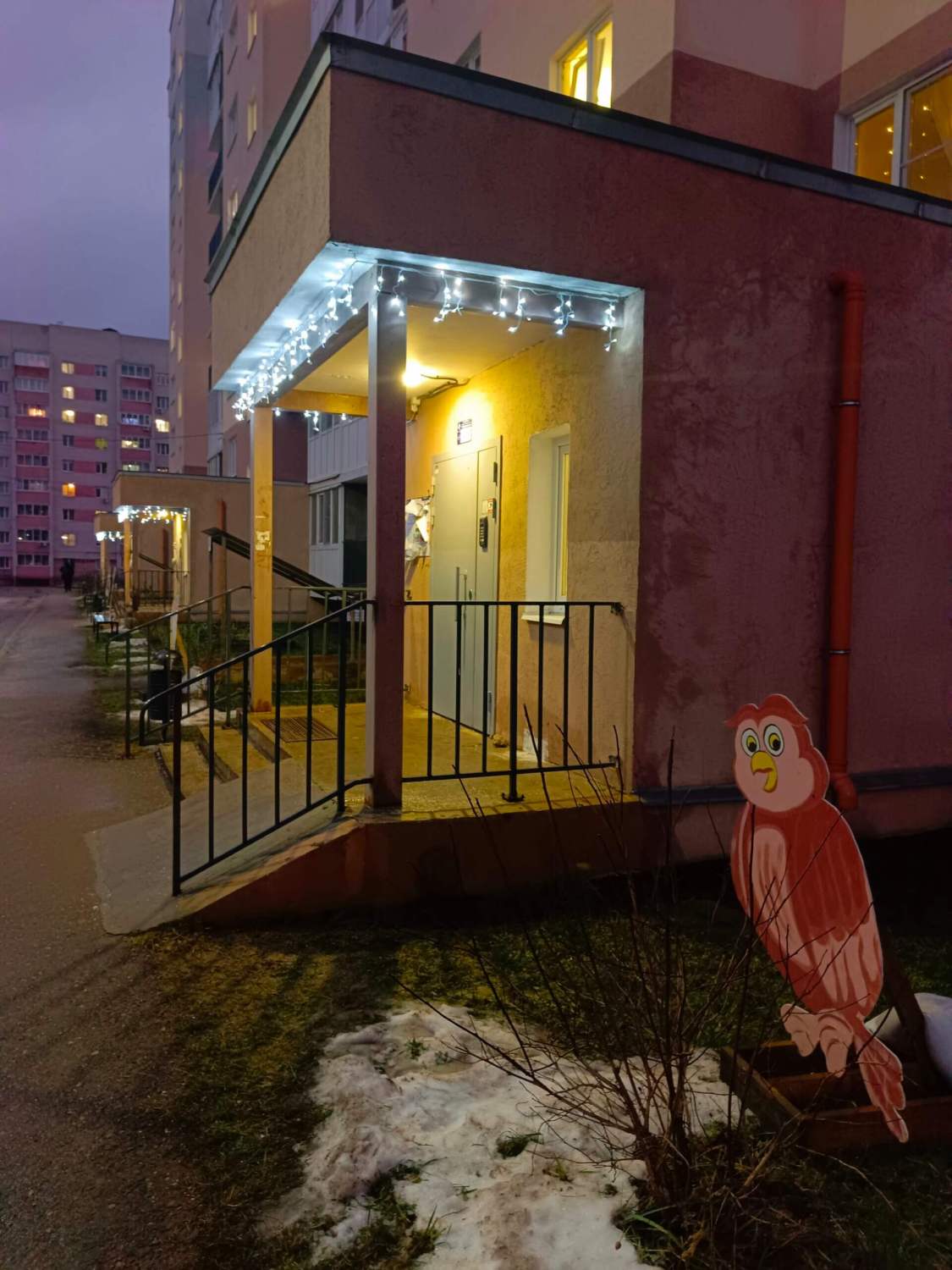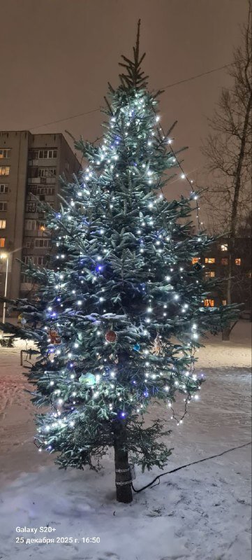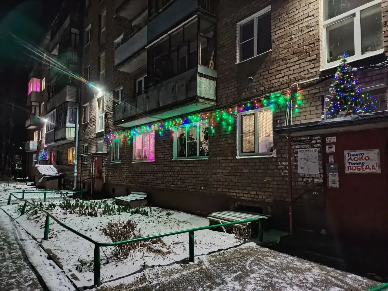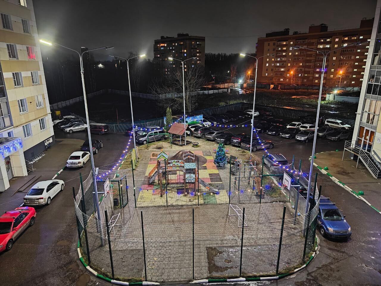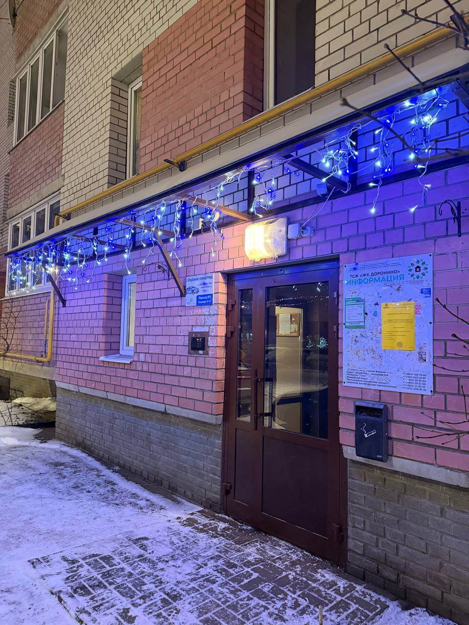 Для создания праздничного настроения во дворе установлена гирлянда над детской площадкой, световыми гирляндами оформлены хвойные насаждения у подъездов.