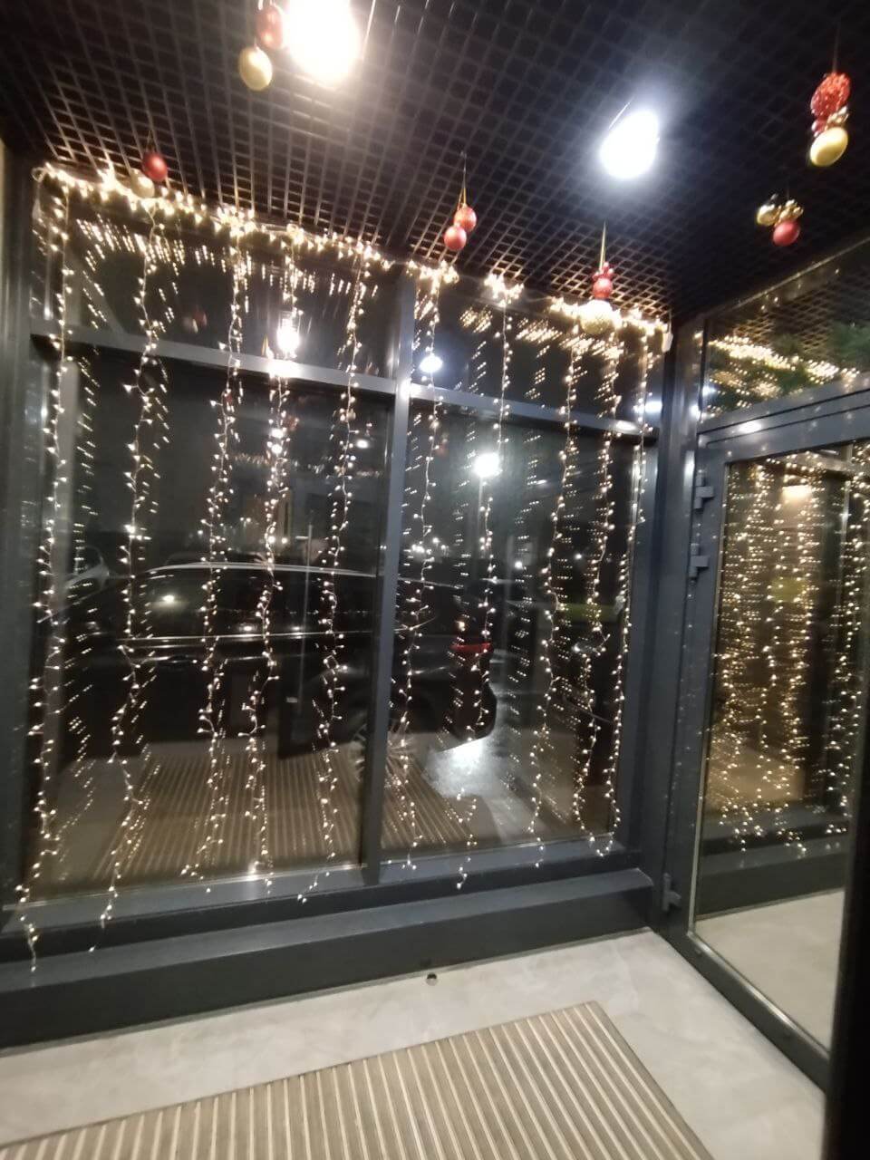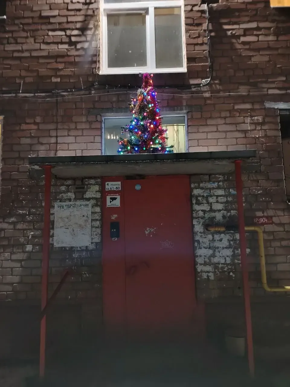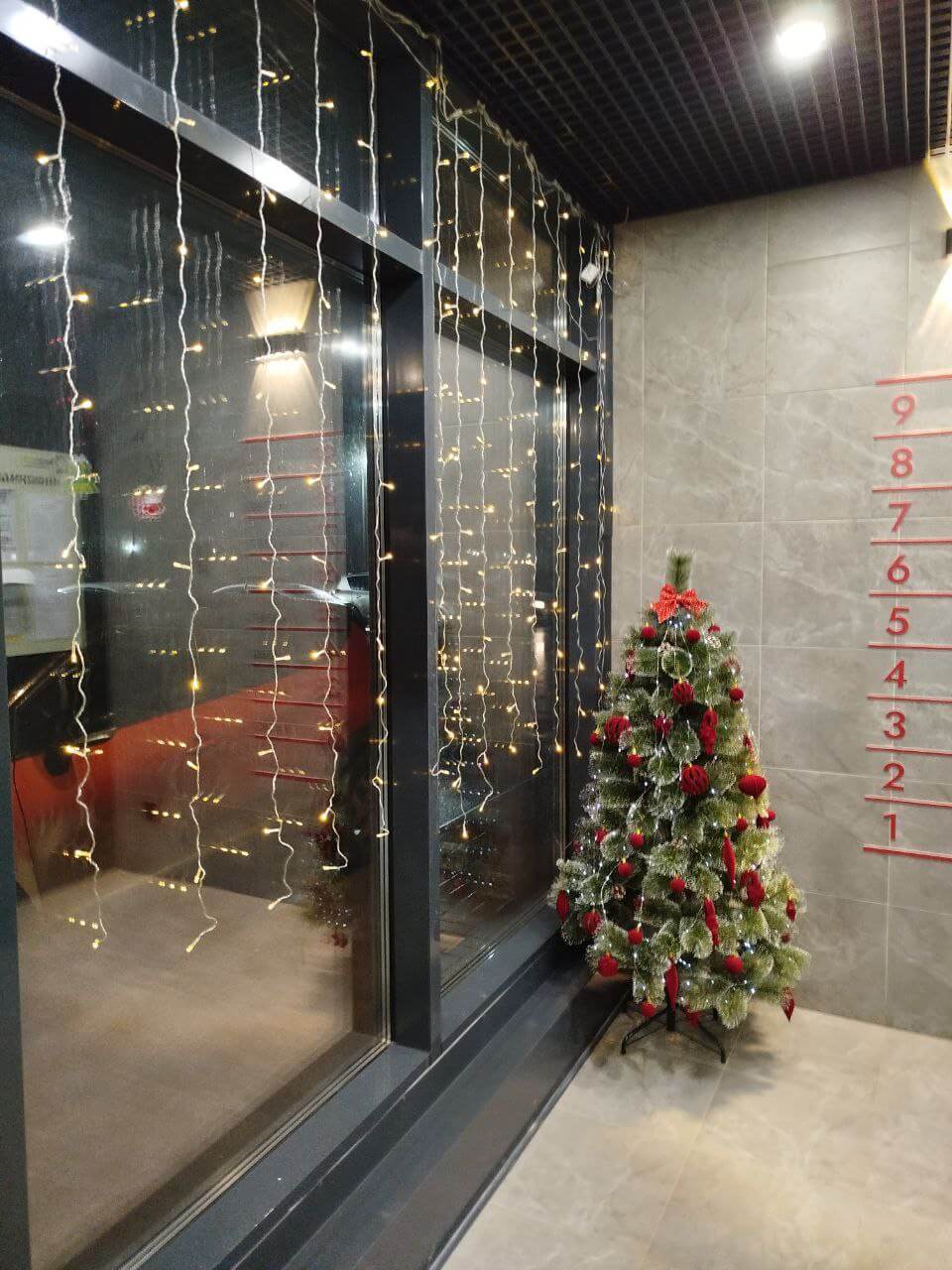 Украсили панарамное окно подъезда гирляндой, изобразив Елочку.