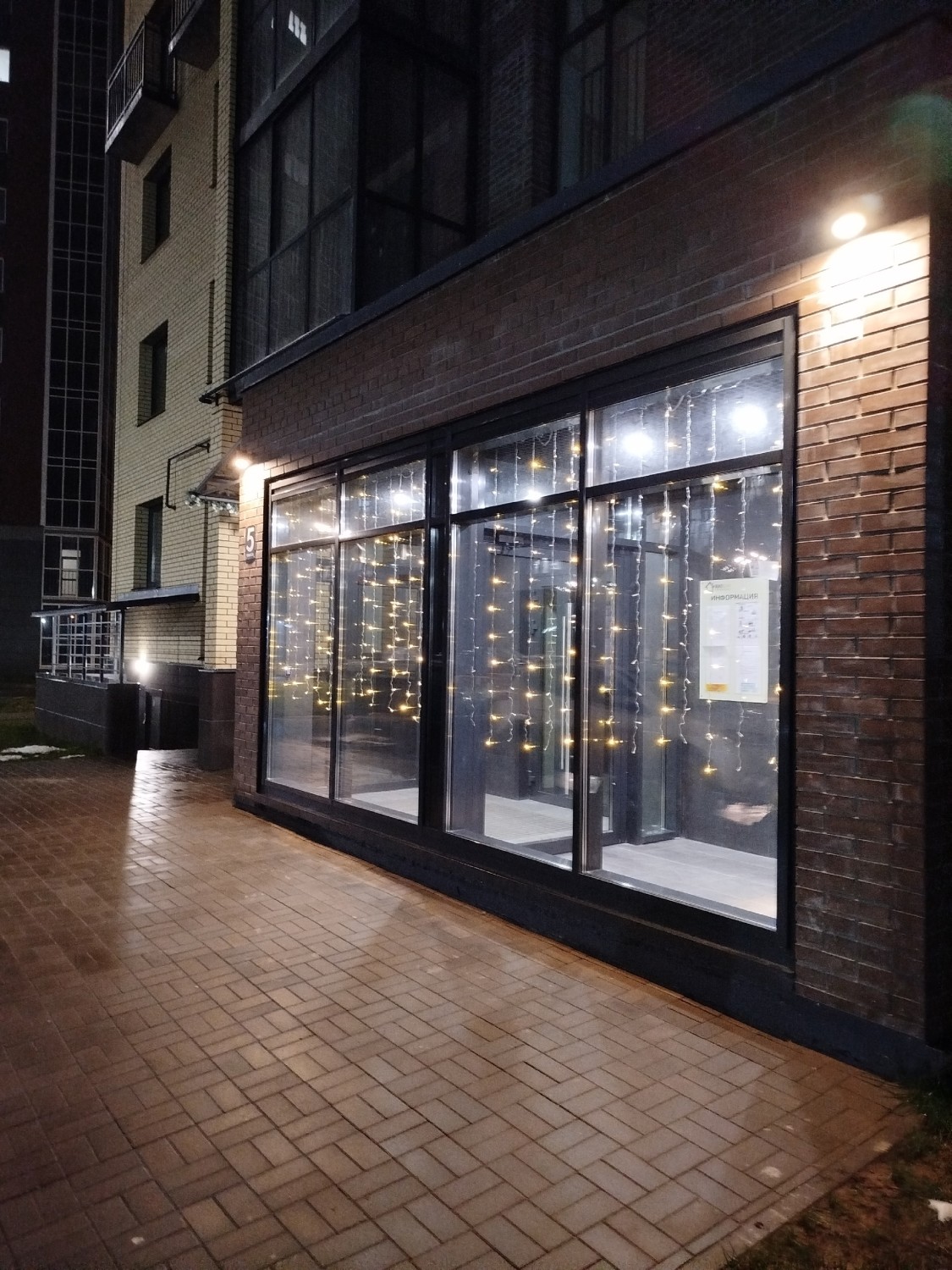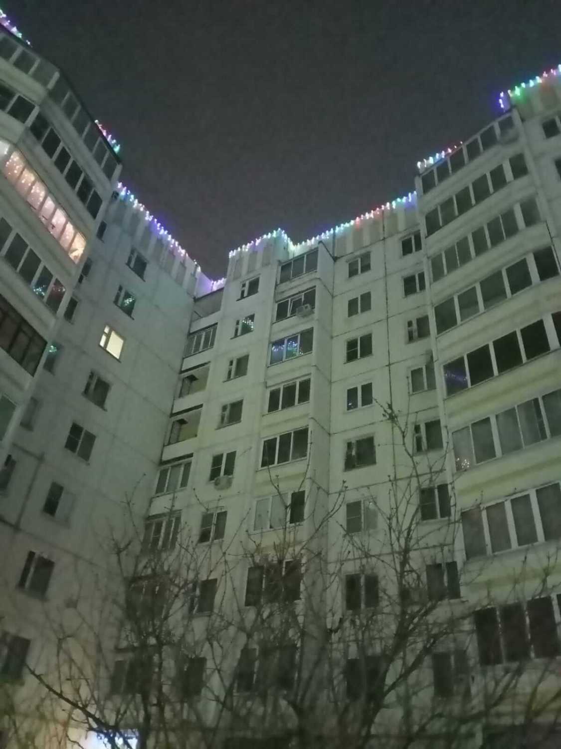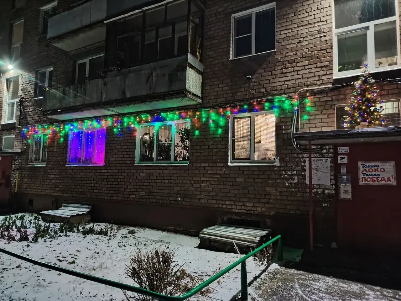 Украсили панарамное окно подъезда гирляндой, изобразив Елочку.
