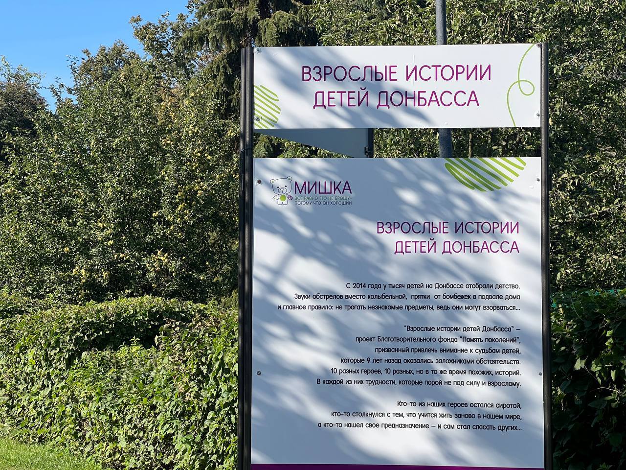 Фотовыставка включает в себя 10 фотографий — 10 пронзительных историй маленьких героев с Донбасса. Кто-то из ребят остался сиротой, кто-то столкнулся с таким ужасом, что приходится заново учиться жить в нашем мире, а кто-то нашел своё предназначение и сам стал спасать других.